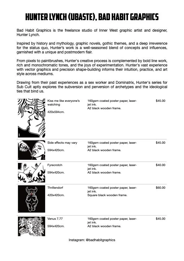 “This art exhibition shines a flickering neon light into the gritty corners of Sydney's leather and lace subcultures. These subcultures are innately Queer, and serve as a breeding ground for experimentation, creativity and innovation.”